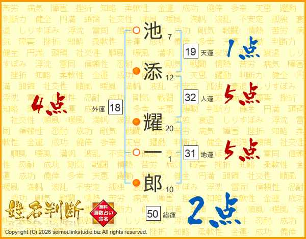 池(7画)添(12画) 耀(20画)一(1画)郎(10画)