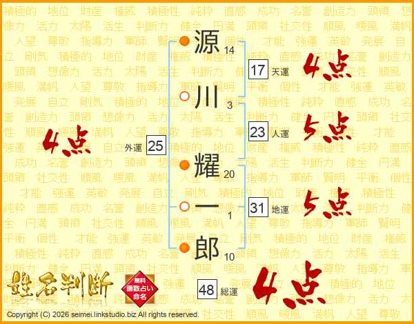 源(14画)川(3画) 耀(20画)一(1画)郎(10画)