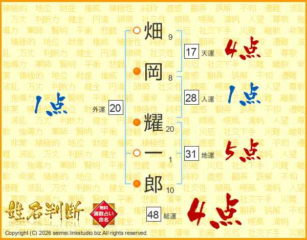 畑(9画)岡(8画) 耀(20画)一(1画)郎(10画)