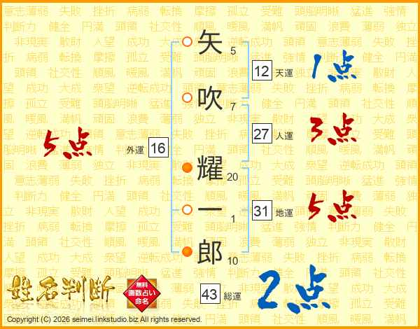 矢吹耀一郎さんの総運は43画の2点!