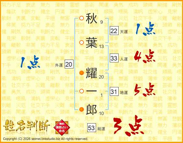 秋(9画)葉(13画) 耀(20画)一(1画)郎(10画)