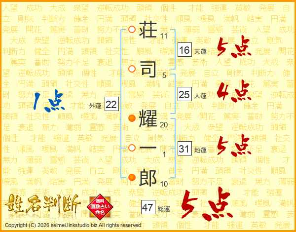 荘(11画)司(5画) 耀(20画)一(1画)郎(10画)