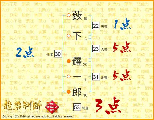 薮(19画)下(3画) 耀(20画)一(1画)郎(10画)
