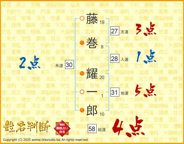 藤(19画)巻(8画) 耀(20画)一(1画)郎(10画)
