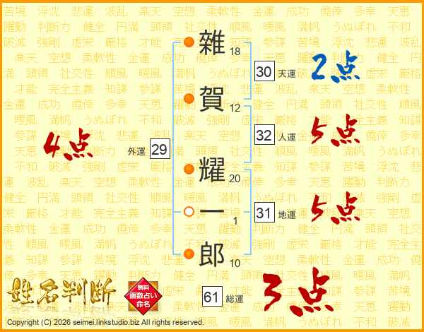 雜(18画)賀(12画) 耀(20画)一(1画)郎(10画)