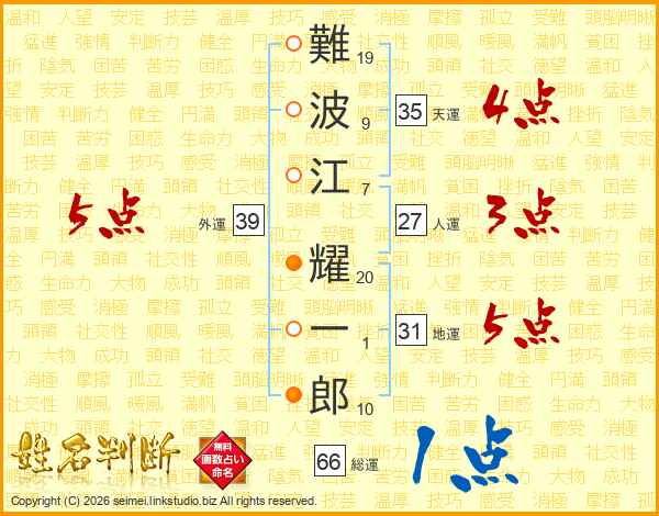 難(19画)波(9画)江(7画) 耀(20画)一(1画)郎(10画)