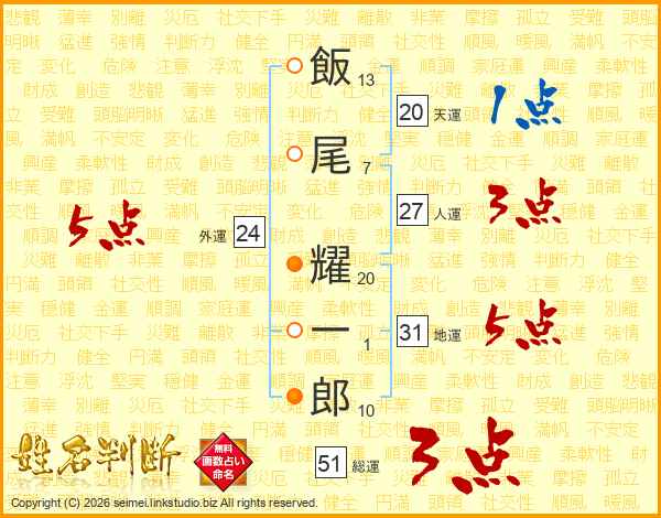 飯(13画)尾(7画) 耀(20画)一(1画)郎(10画)