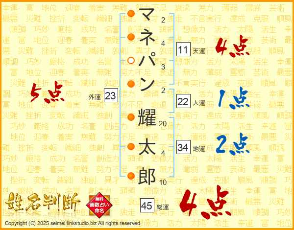 マ(2画)ネ(4画)パ(3画)ン(2画) 耀(20画)太(4画)郎(10画)