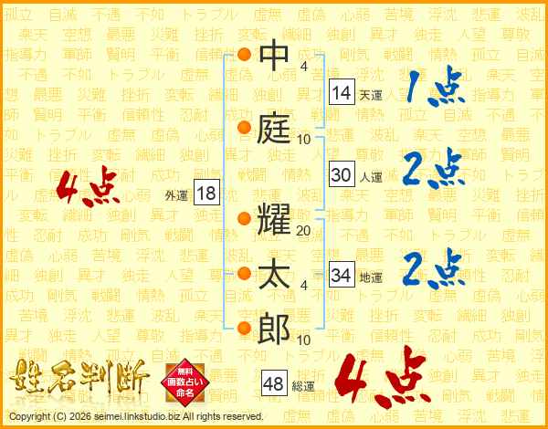 中(4画)庭(10画) 耀(20画)太(4画)郎(10画)