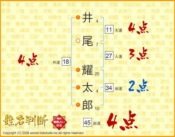 井(4画)尾(7画) 耀(20画)太(4画)郎(10画)