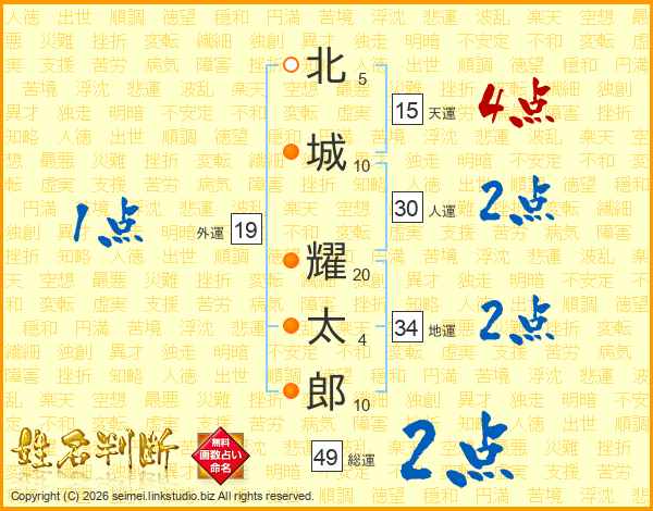 北(5画)城(10画) 耀(20画)太(4画)郎(10画)