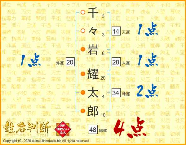 千(3画)々(3画)岩(8画) 耀(20画)太(4画)郎(10画)