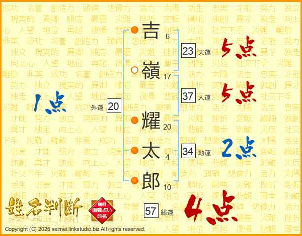 吉(6画)嶺(17画) 耀(20画)太(4画)郎(10画)
