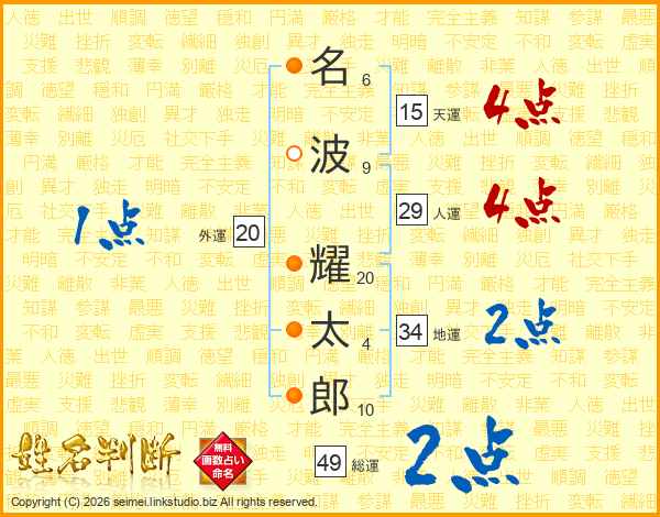 名(6画)波(9画) 耀(20画)太(4画)郎(10画)