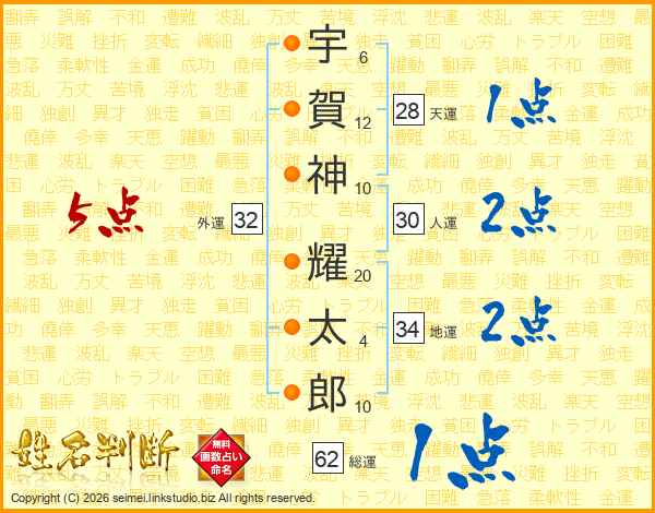 宇(6画)賀(12画)神(10画) 耀(20画)太(4画)郎(10画)