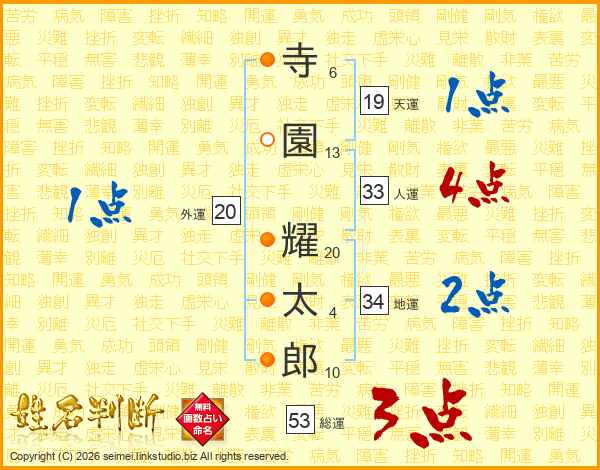 寺(6画)園(13画) 耀(20画)太(4画)郎(10画)