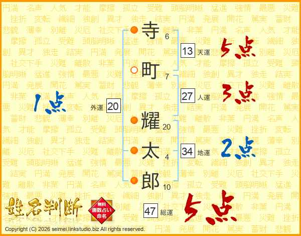 寺(6画)町(7画) 耀(20画)太(4画)郎(10画)
