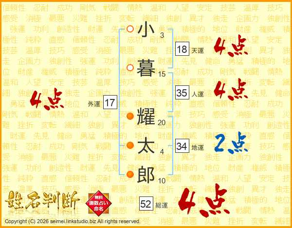 小暮耀太郎さんの総運は52画の4点!