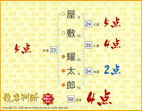 屋(9画)敷(15画) 耀(20画)太(4画)郎(10画)