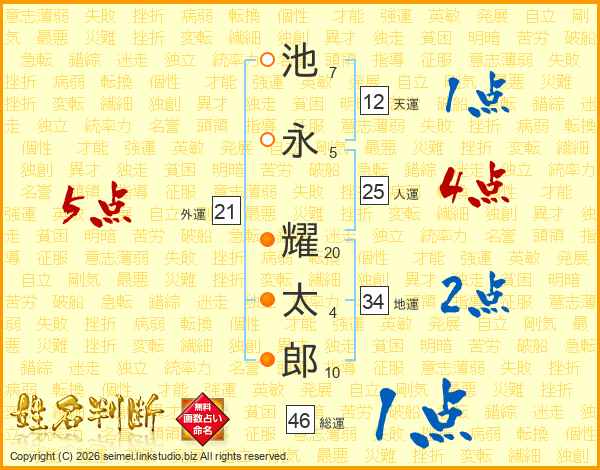 池(7画)永(5画) 耀(20画)太(4画)郎(10画)