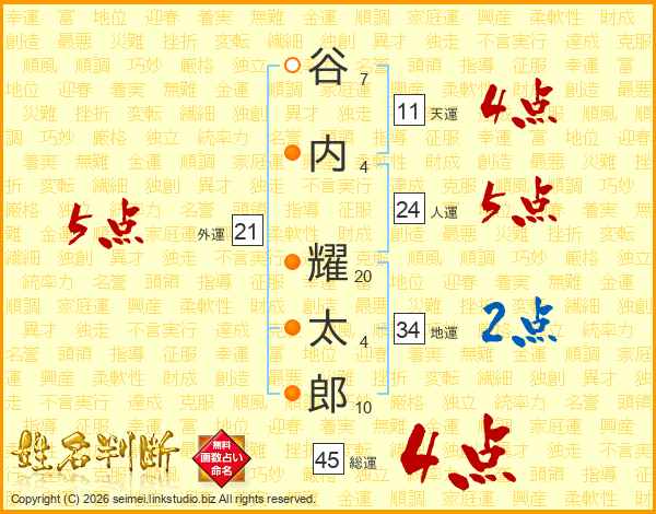 谷(7画)内(4画) 耀(20画)太(4画)郎(10画)
