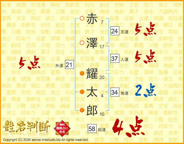 赤(7画)澤(17画) 耀(20画)太(4画)郎(10画)