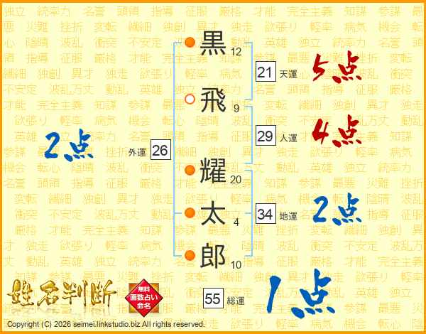 黒(12画)飛(9画) 耀(20画)太(4画)郎(10画)