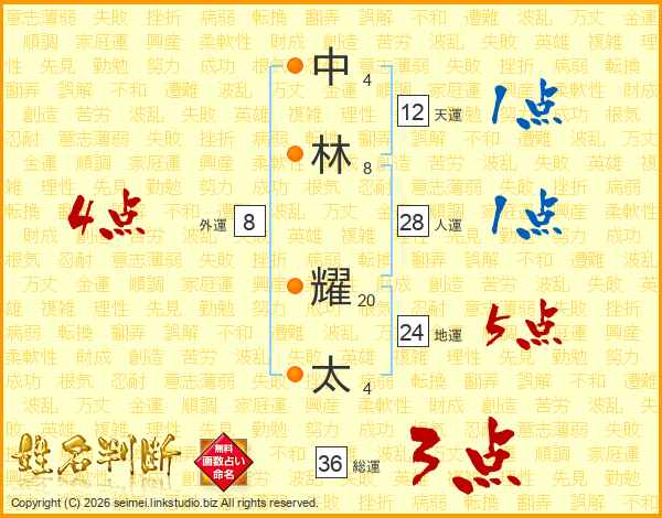 中(4画)林(8画) 耀(20画)太(4画)
