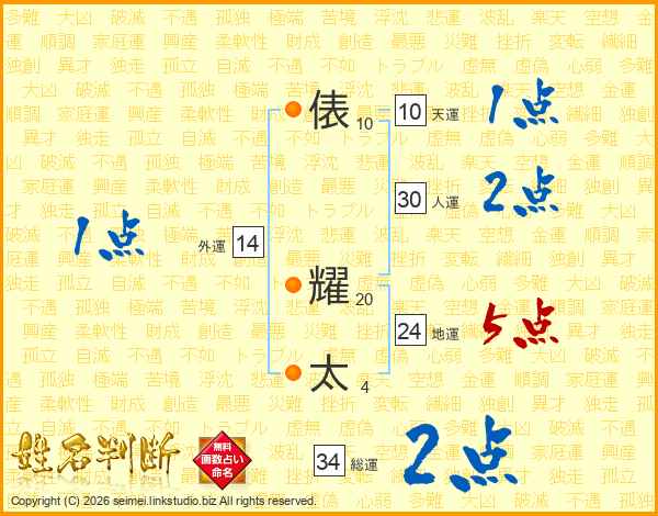 あなたの人生を表す1番重要な運勢です。生涯を通じて影響する総合運となり、主に50歳以降の晩年期に影響を及ぼします。苗字と名前の合計画数。