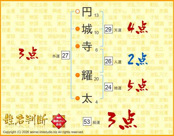 円(13画)城(10画)寺(6画) 耀(20画)太(4画)