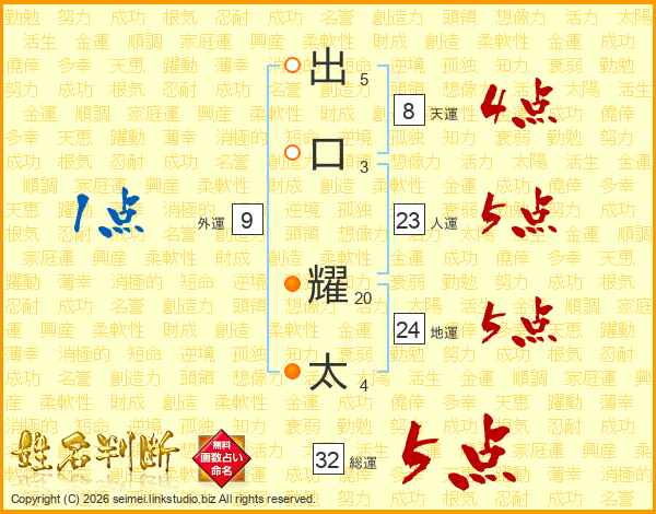 生活面を象徴する運勢です。外部から受ける影響力を表し、結婚運、家庭運や職場、環境への順応性を表します。総運から人運を引いた画数。姓や名が1文字の場合を除く。
