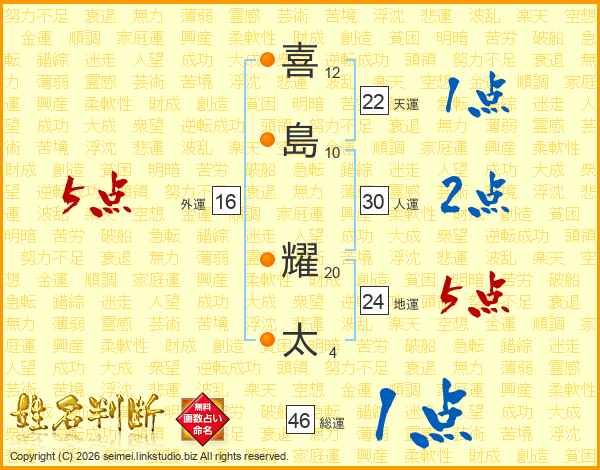 喜(12画)島(10画) 耀(20画)太(4画)