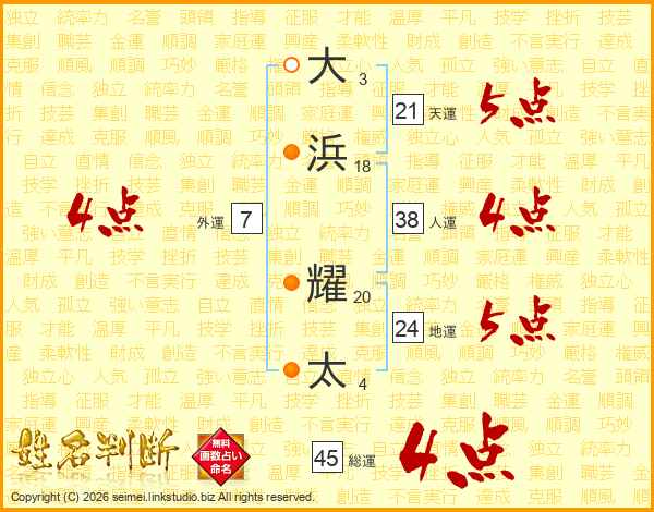 大浜耀太さんの総運は45画の4点!