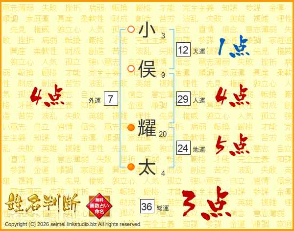 小(3画)俣(9画) 耀(20画)太(4画)