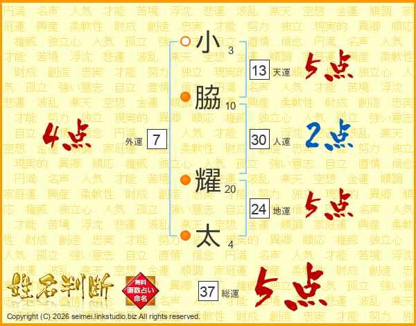 家系が持つ宿命的な運勢を表します。祖先から受け継いだ苗字ですので自分の力が及びません。家柄を象徴します。苗字の合計画数。
