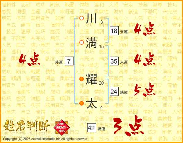 川(3画)満(15画) 耀(20画)太(4画)