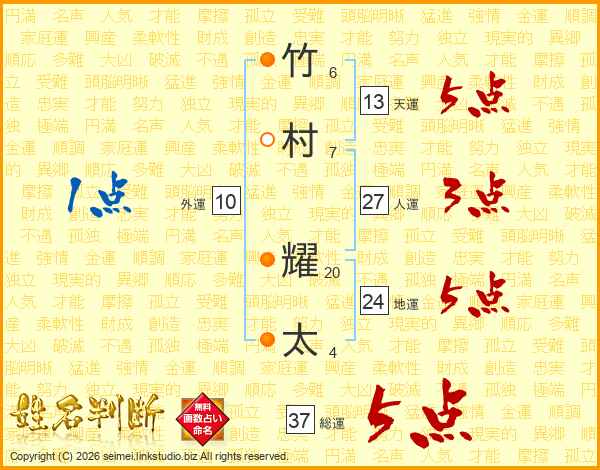 竹村耀太さんの総運は37画の5点!