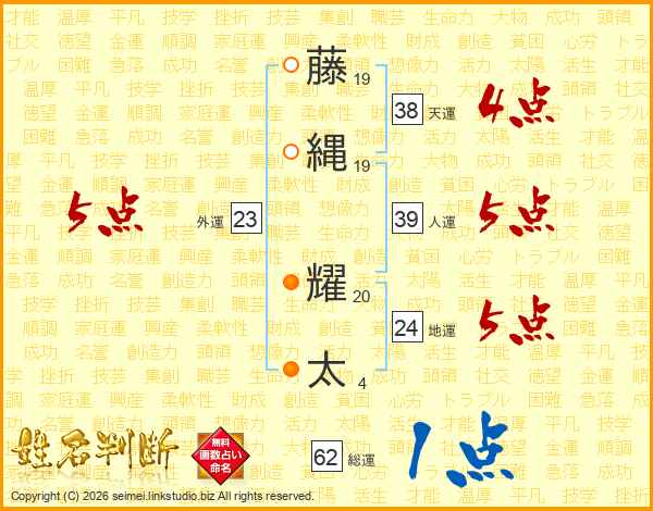 藤(19画)縄(19画) 耀(20画)太(4画)