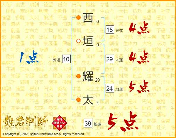生活面を象徴する運勢です。外部から受ける影響力を表し、結婚運、家庭運や職場、環境への順応性を表します。総運から人運を引いた画数。姓や名が1文字の場合を除く。