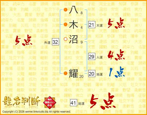 家系が持つ宿命的な運勢を表します。祖先から受け継いだ苗字ですので自分の力が及びません。家柄を象徴します。苗字の合計画数。