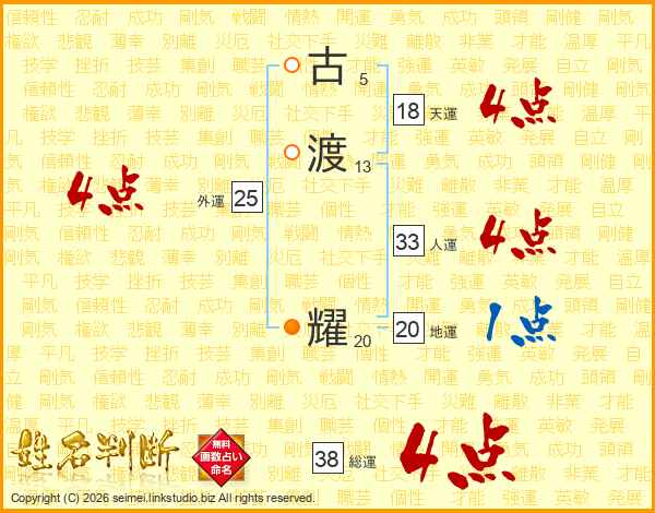 家系が持つ宿命的な運勢を表します。祖先から受け継いだ苗字ですので自分の力が及びません。家柄を象徴します。苗字の合計画数。