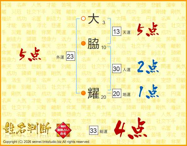 生活面を象徴する運勢です。外部から受ける影響力を表し、結婚運、家庭運や職場、環境への順応性を表します。総運から人運を引いた画数。姓や名が1文字の場合を除く。