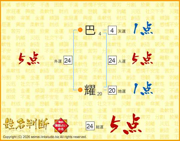 生活面を象徴する運勢です。外部から受ける影響力を表し、結婚運、家庭運や職場、環境への順応性を表します。総運から人運を引いた画数。姓や名が1文字の場合を除く。