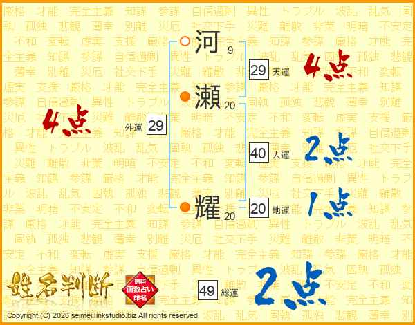 画数の奇数(○陽)と偶数(●陰)の配列で吉凶を占います。どちらかにかたよる名前は大凶名で避ける必要があります。画数の奇数偶数。