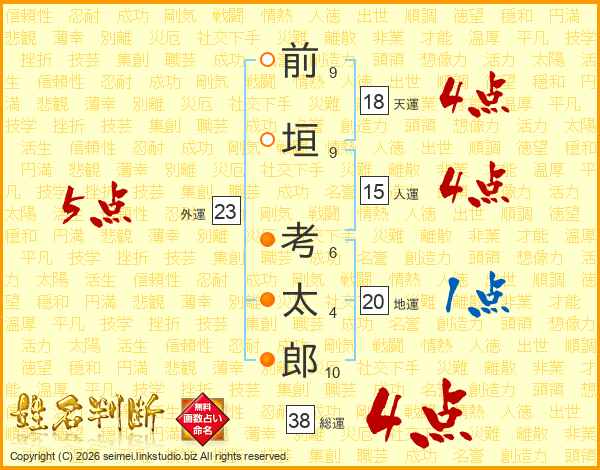 前(9画)垣(9画) 考(6画)太(4画)郎(10画)
