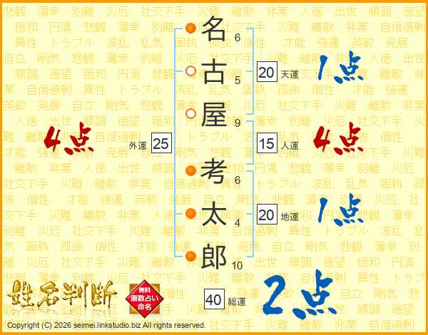 名古屋考太郎さんの総運は40画の2点!
