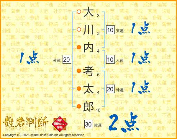 大(3画)川(3画)内(4画) 考(6画)太(4画)郎(10画)