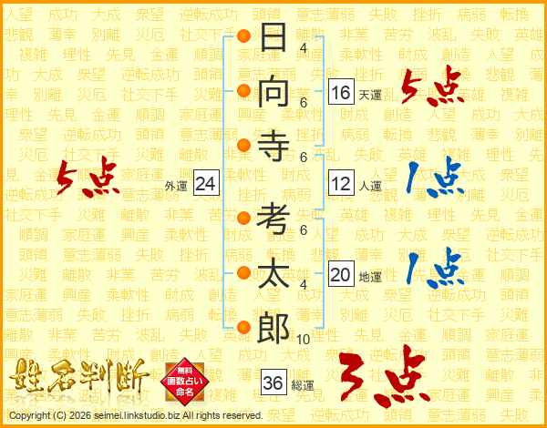 日向寺考太郎さんの総運は36画の3点!