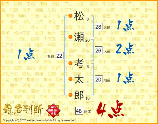 松(8画)瀬(20画) 考(6画)太(4画)郎(10画)