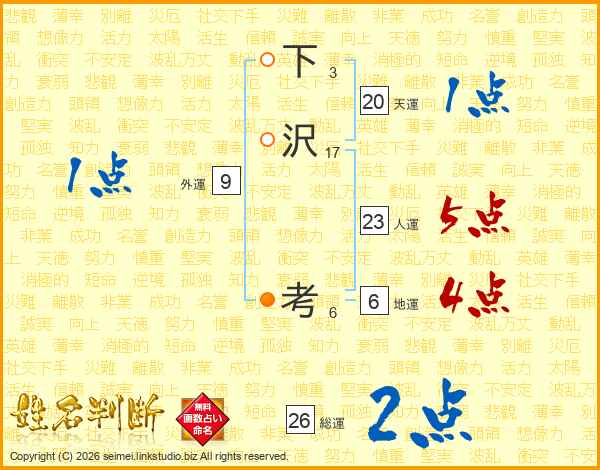 生活面を象徴する運勢です。外部から受ける影響力を表し、結婚運、家庭運や職場、環境への順応性を表します。総運から人運を引いた画数。姓や名が1文字の場合を除く。